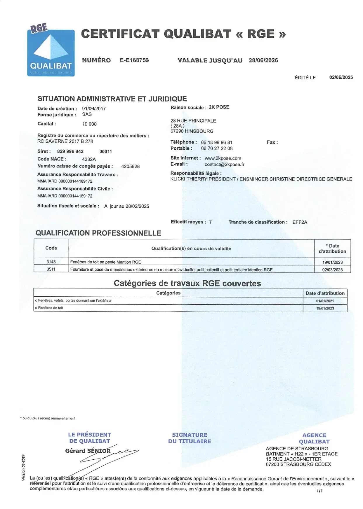 Si 2K Pose est une jeune entreprise, Thierry KLICKI, son gérant, a quant à lui 30 ans d’expérience dans le domaine ! Expérience acquise chez la société Gerling ! La précision et la qualité sont au rendez-vous. Et pour preuve, l’entreprise 2K Pose est certifiée RGE Qualibat. Ce label concerne les artisans Reconnus Garants de l’Environnement. En plus d’être un gage de qualité et de savoir-faire, c’est aussi la possibilité pour vous de bénéficier d’aides financières pour la pose de menuiseries neuves. Un bon coup de pouce pour la transition énergétique ! Renseignez-vous !